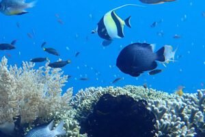 - Angelfish and butterflyfish adding pops of color to the reef.